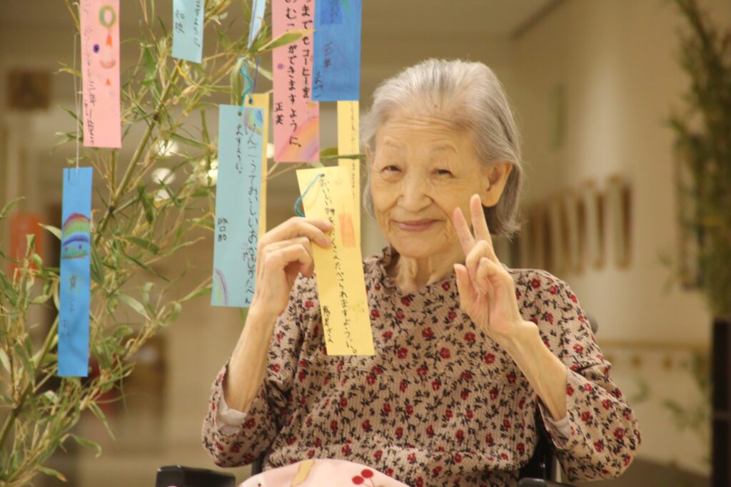 入居者さんの願いごとを中島小学校の皆さんが短冊に書いてくれました。願い事の内容に合わせてイラストを添えてくれていたので、入居者さんに楽しく見てもらえましたよ。愛泉寮では7月7日午後6時~7時にお菓子を配ります。中島小学校のみなさんも、ご近所のお子さんたちも、来てくれると嬉しいです。待ってま~す。